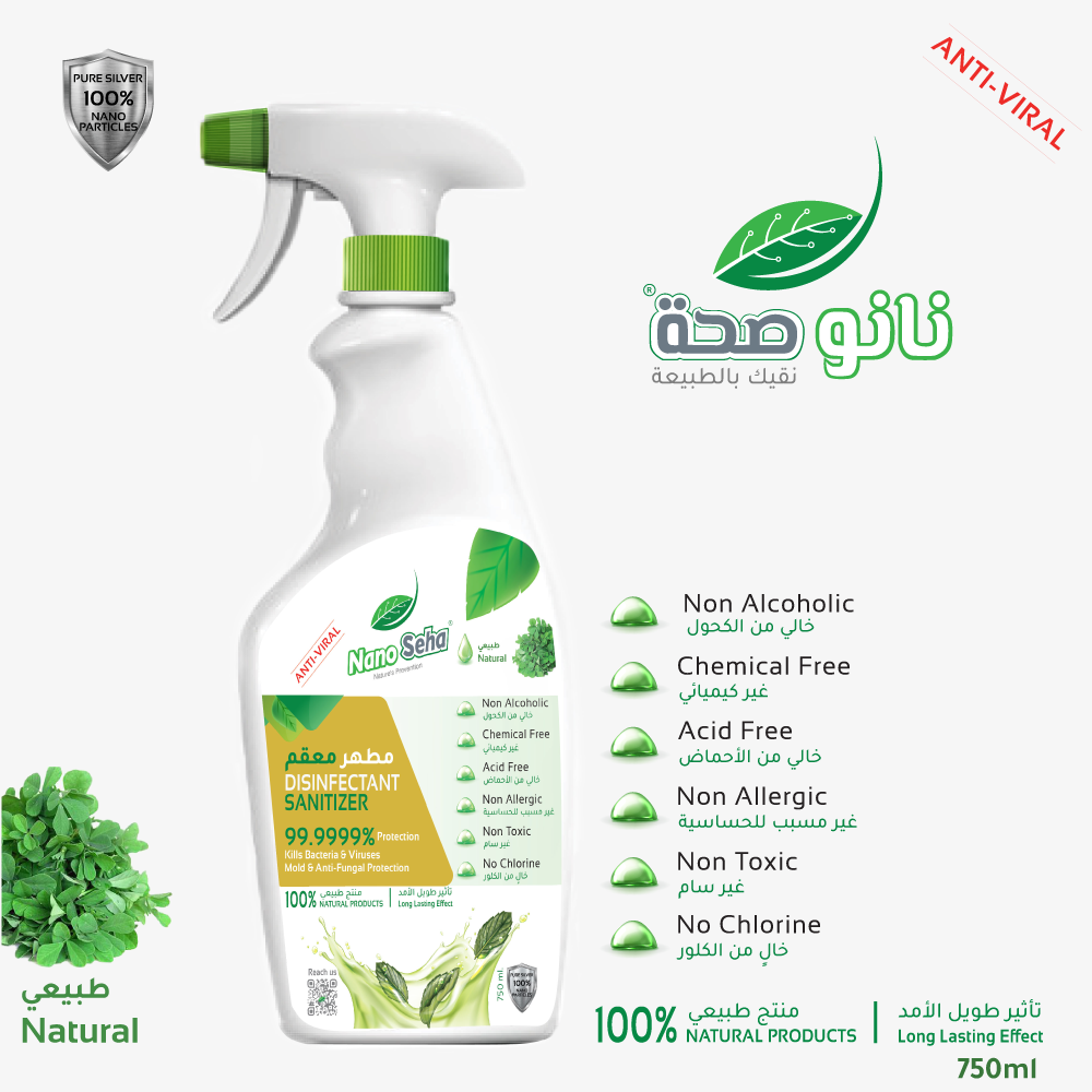 This Natural Sanitizer is safe for human use and non-irritant, killing 99.9999% of bacteria, viruses, mold, fungi, and spores. Our formula uses 100% pure natural, Non  Alcoholic, Chemical Free, Non Toxic, Long Lasting, Acid free, Non Allergic and No Chlorine product along with moisturising  and soothing Natural leaves. NanoSeha patented Green Nanotechnology forays expands to develop antibacterial products to eradicate infections in hospitals, kitchens, hotels, public dwellings & residences.  750ml Disinfectant Sanitizer made in UAE.